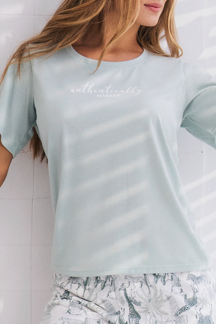 Pijama para mujer en algodón suave y cómoda, con camiseta manga corta diseñada junto a un capri estampado con cintura elástica
