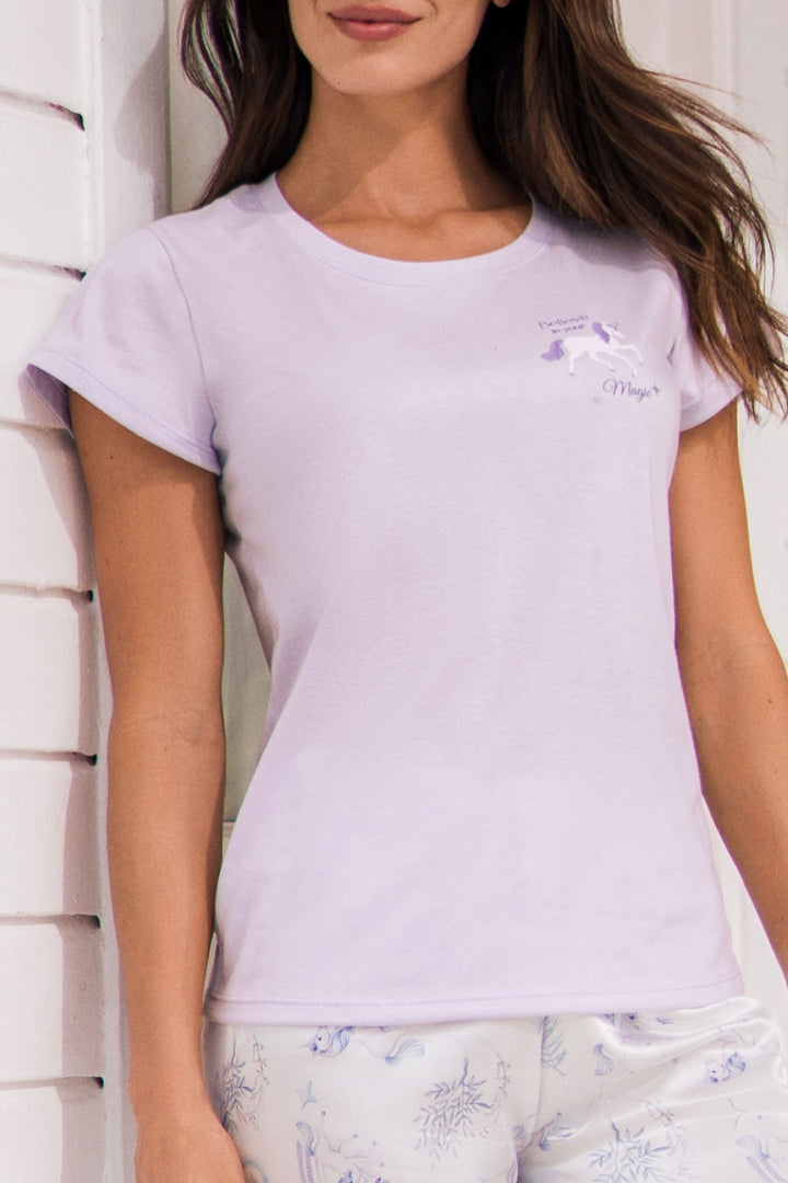 Pijama para mujer en Satín con pantalón de cintura elástica y camiseta manga corta estampada.