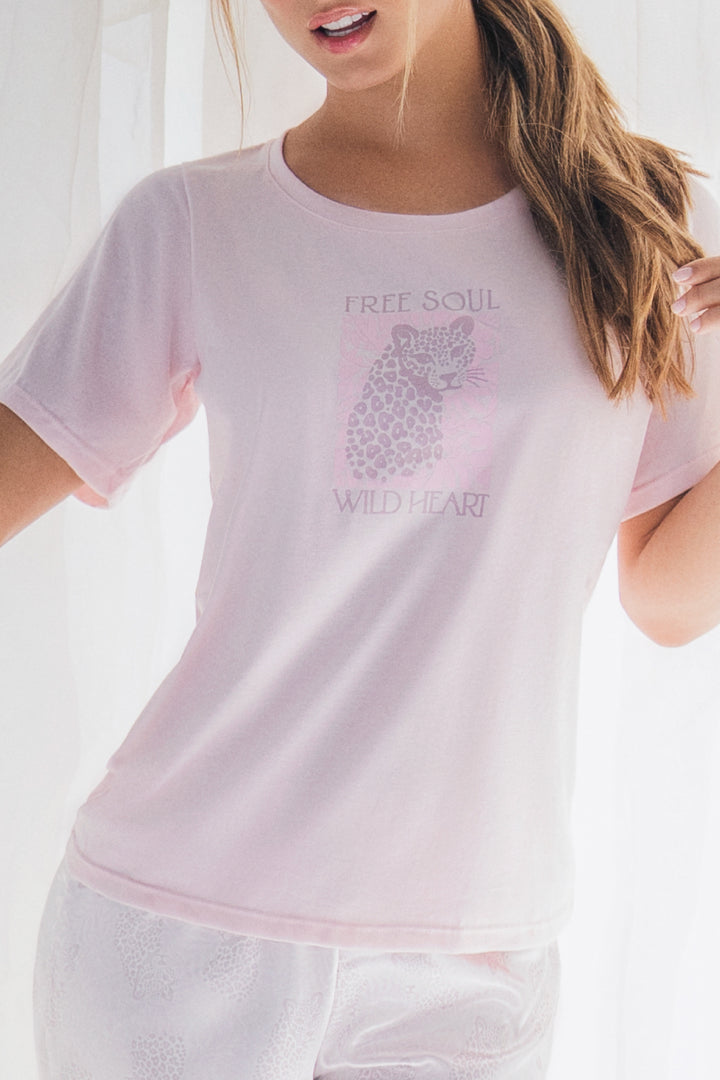 Pijama para mujer en Satín con pantalón de cintura elástica y camiseta manga corta estampada.
