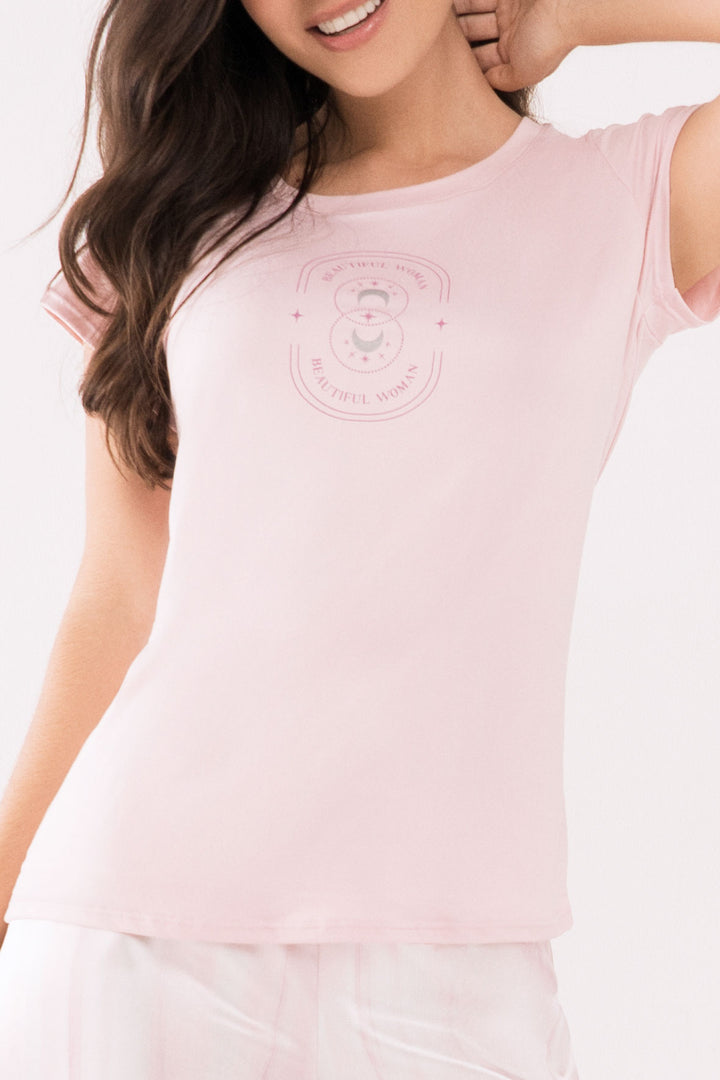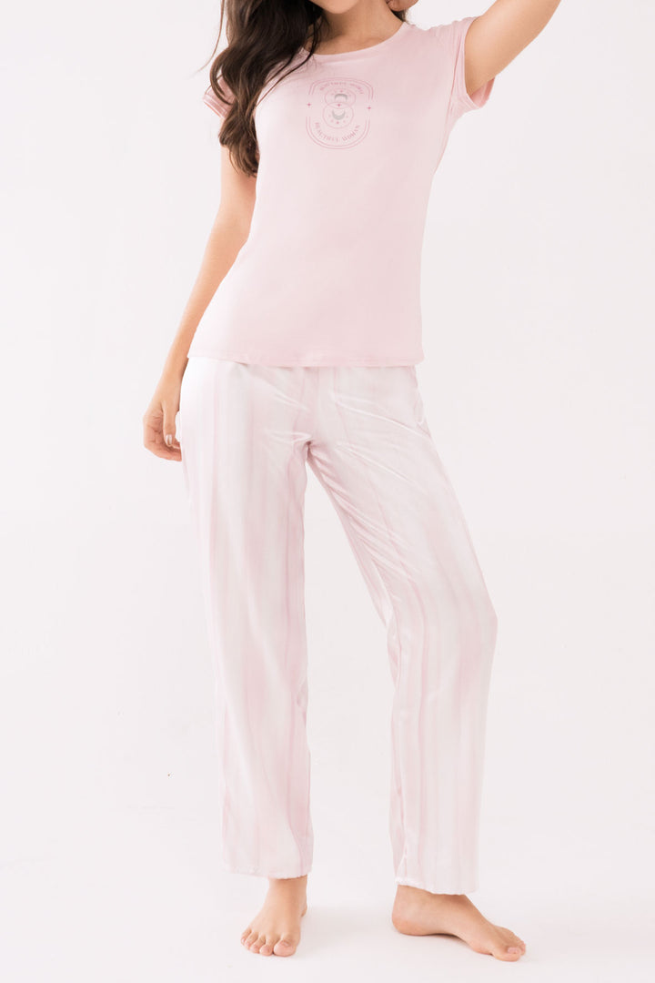 Pijama para mujer en Satín con pantalón de cintura elástica y camiseta manga corta estampada.